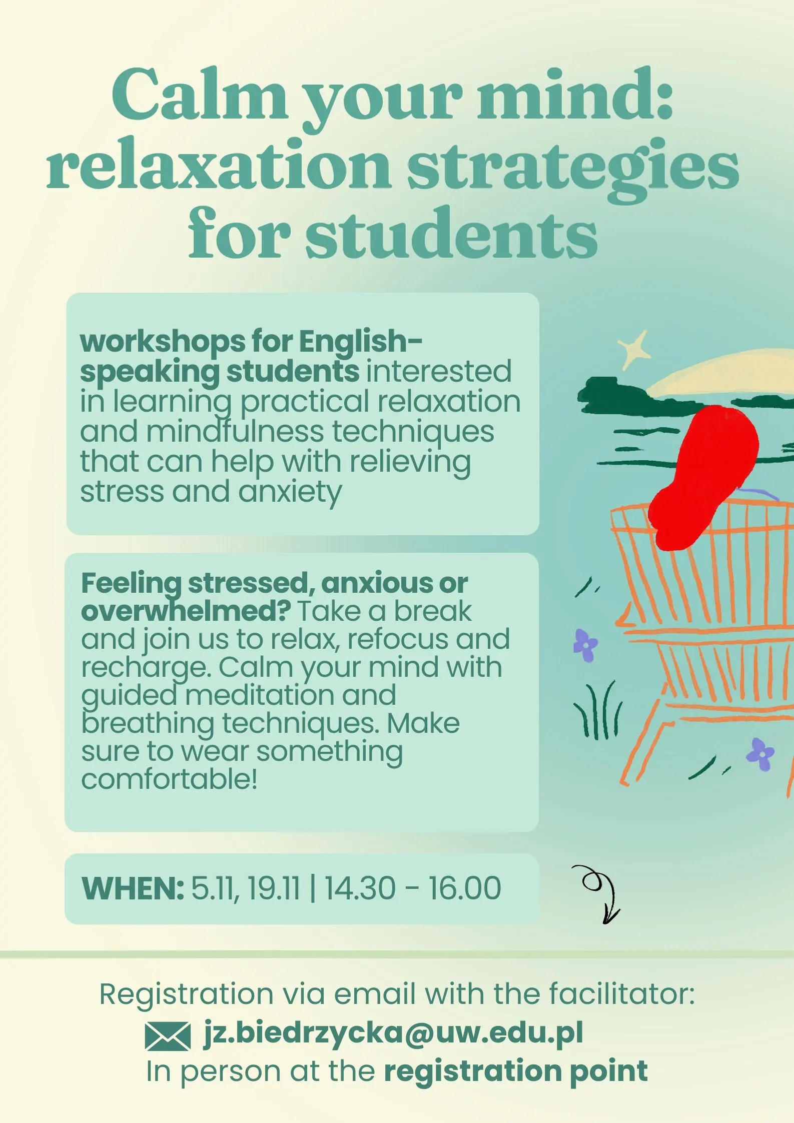 How to sign up? At Psychological Counseling Center at Pasteura 7 or by e-mail: jz.biedrzycka@uw.edu. pl